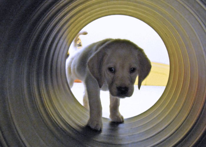 A yellow lab puppy investigates a plastic tunnel as part of its training.