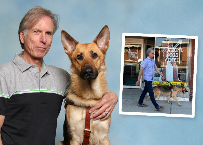 Graduate Marlin in his official portrait with his Seeing Eye dog Champ, a German shepherd with large ears. Marlin has his arm around Champ, and Champ is looking straight at the camera with a serious expression on his face. Marlin and Champ are also shown in a separate photo walking on a sidewalk in front of a record store.